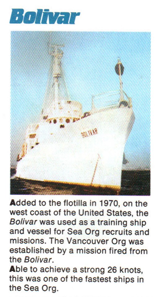 ) of February 24, 1970. She was renamed the Bolivar in the OOD of June 22, 1970. The Bolivar was a Sea OrgAbbreviation for Sea Organization. (Modern Management Technology Defined (C) 1976).