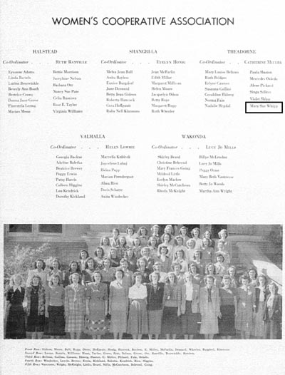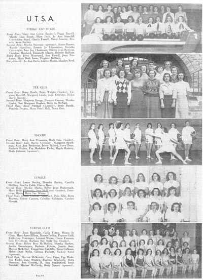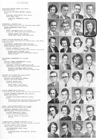 1951 was Mary Sue's senior year at the university. She is listed in the senior section, page 409, of the "Cactus Yearbook, Class of 1951". She majored in English and had activities of WICA (Women's Inter-Community Association), Touche, Tumble and the Houston Club.