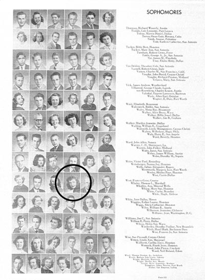 After Mary Sue's freshman year of college at Rice University[8] she attended the University of Texas at Austin, the same university her mother attended [9]. Mary Sue is on three pages of the University's year book - "Cactus Yearbook, Class of 1949". She is listed in the sophomore section of the book on page 112. On page 473, Mary Sue is included in the Tumble section and on page 487, she is listed in the Theadorne section of the "Women's Cooperative Association". Incidentally, 1949, is the same year that Tom Landry, future coach of the Dallas Cowboys, graduated from the University of Texas at Austin. They may have crossed paths during their time at the university.