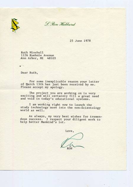 " Ruth Minshull was a writer of Scientology also. She produced a number of books that were very well received, even sold with the approval of the Founder, Lafayette Ron Hubbard. Since his demise these books have stopped being promoted by the Church.